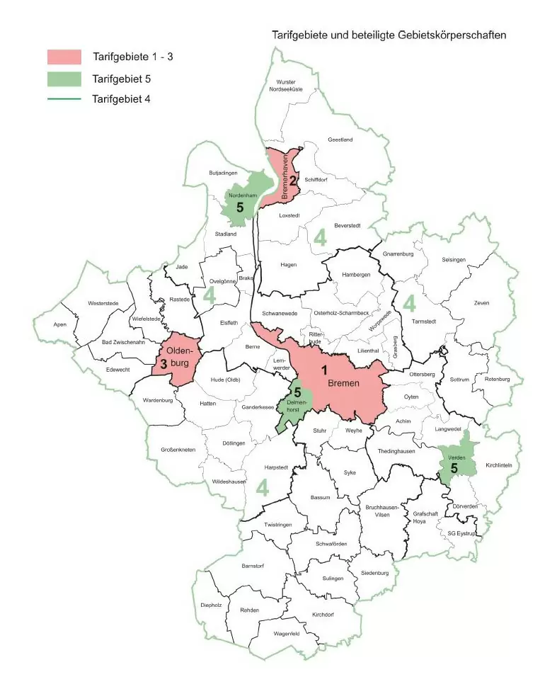 Der Geltungsbereich zeigt die Aufteilung des Verkehrsverbundes Bremen/Niedersachsen (VBN) in Tarifgebiete (siehe: Grafik rechts).