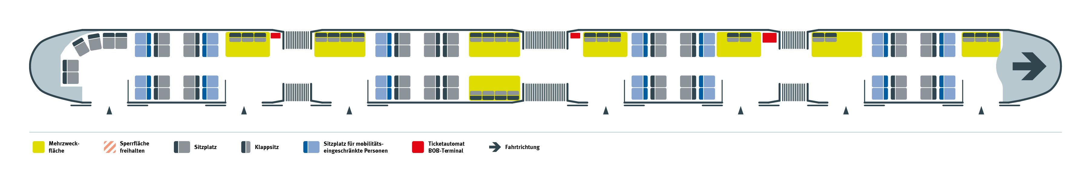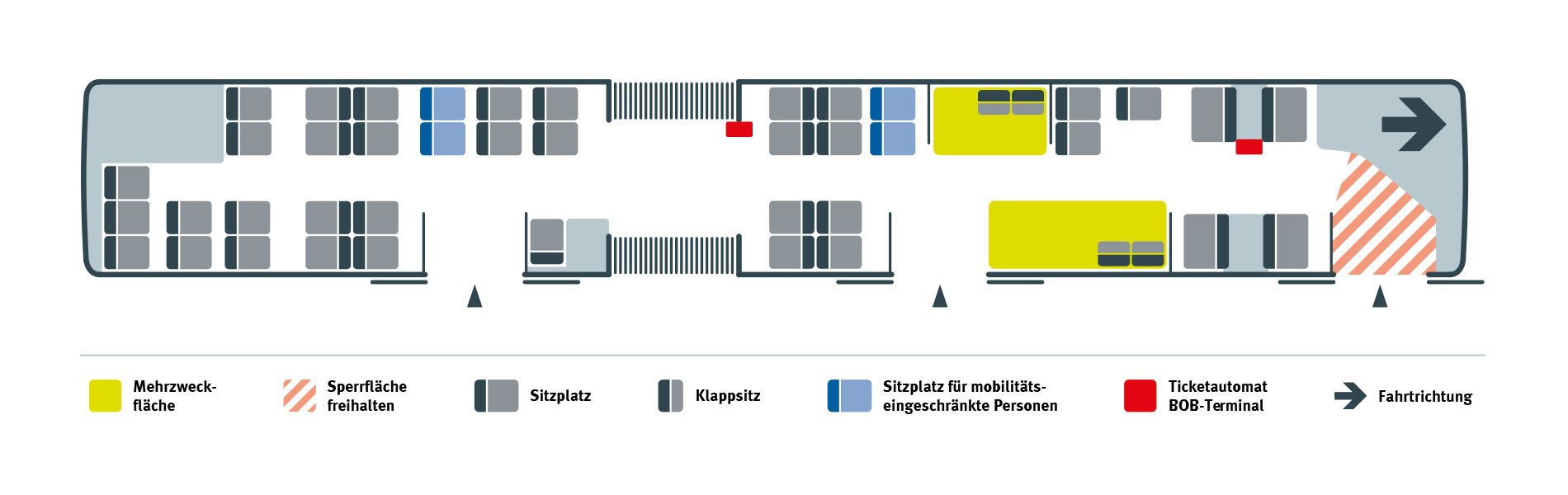 Hier ist eine kurze Übersicht über die wichtigsten Regeln. Sie zeigen auch, wo Sitzplätze, Flächen für Kinderwagen und Fahrräder sowie Ticketautomaten sind. Die vollständigen Regeln kannst du in unseren Beförderungsbedingungen jederzeit nachlesen.